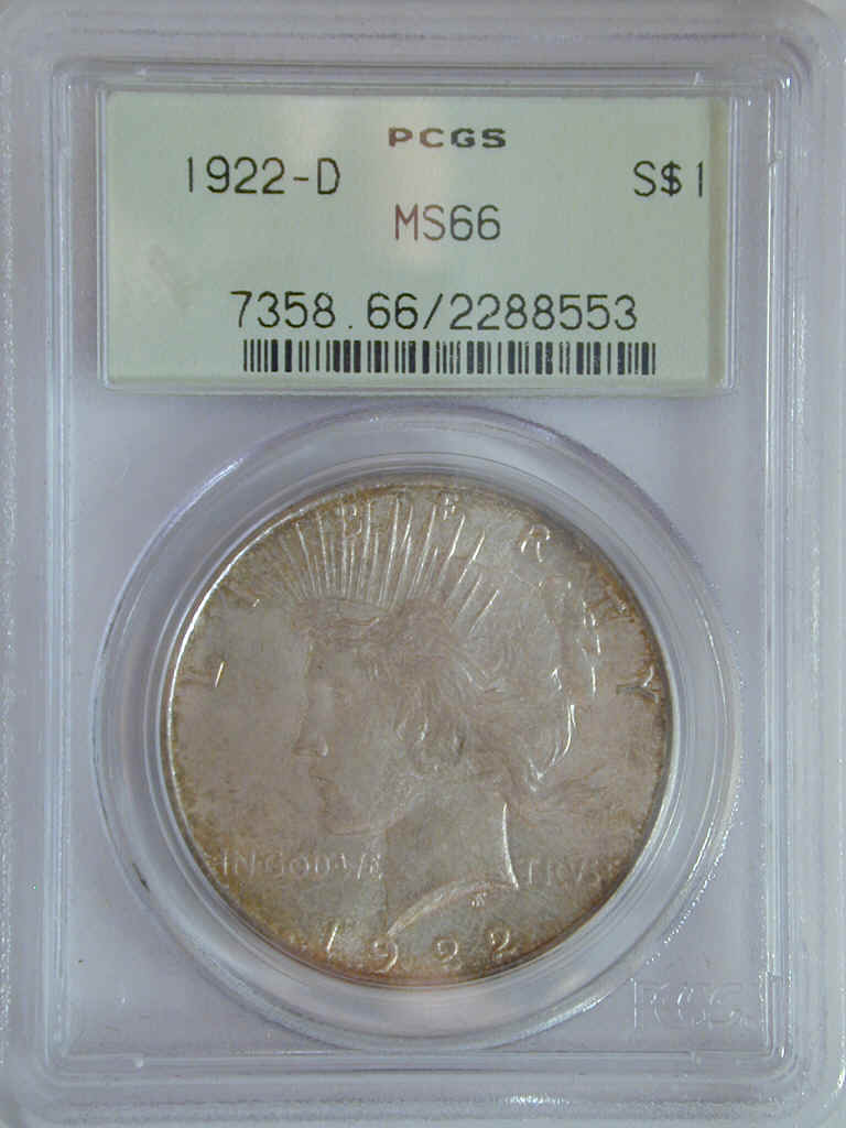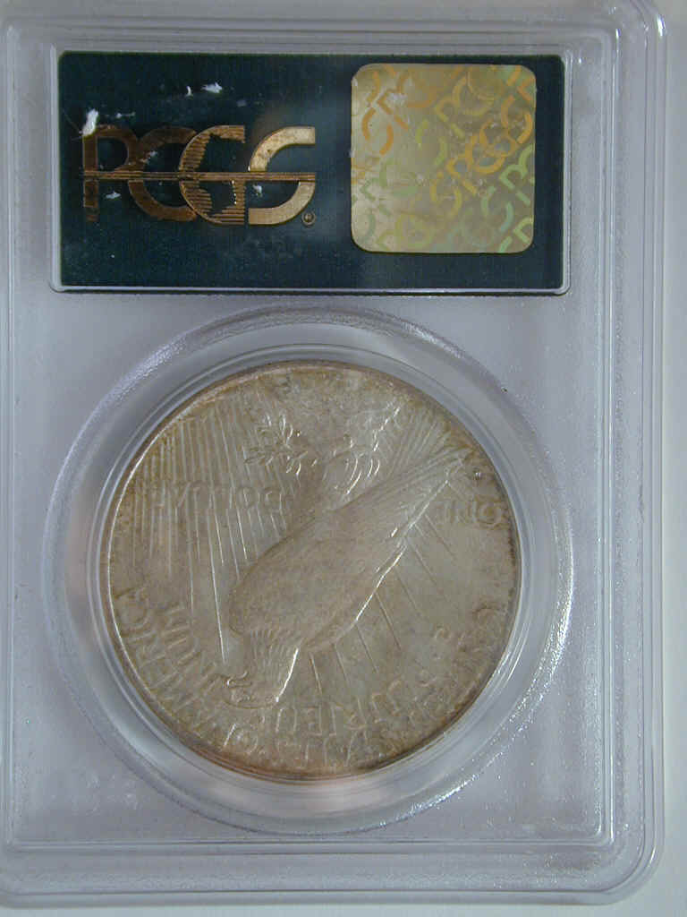 PCGS 4 (1990-1995) PCGS 4, introduced in January 1990, was no longer a slab within a slab. It represented the migration to the plastic, stackable holder that exists today. The size and shape have remained unchanged since the introduction of this holder. PCGS is no longer raised on the reverse but it was added in the lower right corner of the slab. The label was printed on green paper and die cut from this point forward (the perforations are no longer visible at the edge). However, the pigments used to color the paper were very unstable and many have changed color over the years. Most are a pale green or light yellow but many other colors are frequently seen from bright canary yellow to light blue or near white. The print still appears to be from a dot matrix printer with large size numbers and letters. The serial number begins even with or slightly left of the beginning of the bar code.